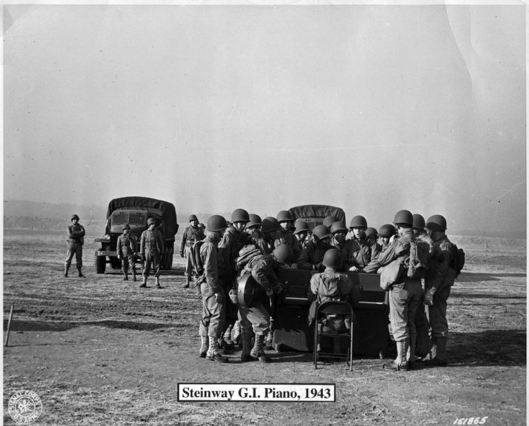 Appelés les Victory Pianos, ces pianos étaient livrés en kit pour remonter le moral des soldats alliés ! Durant la Seconde Guerre mondiale, l’armée américaine passe de grosses commandes de pianos à Steinway & Sons. Des pianos version guerre : robustes, démontables, aux couleurs de l’U.S. Army et de l’U.S. Navy.